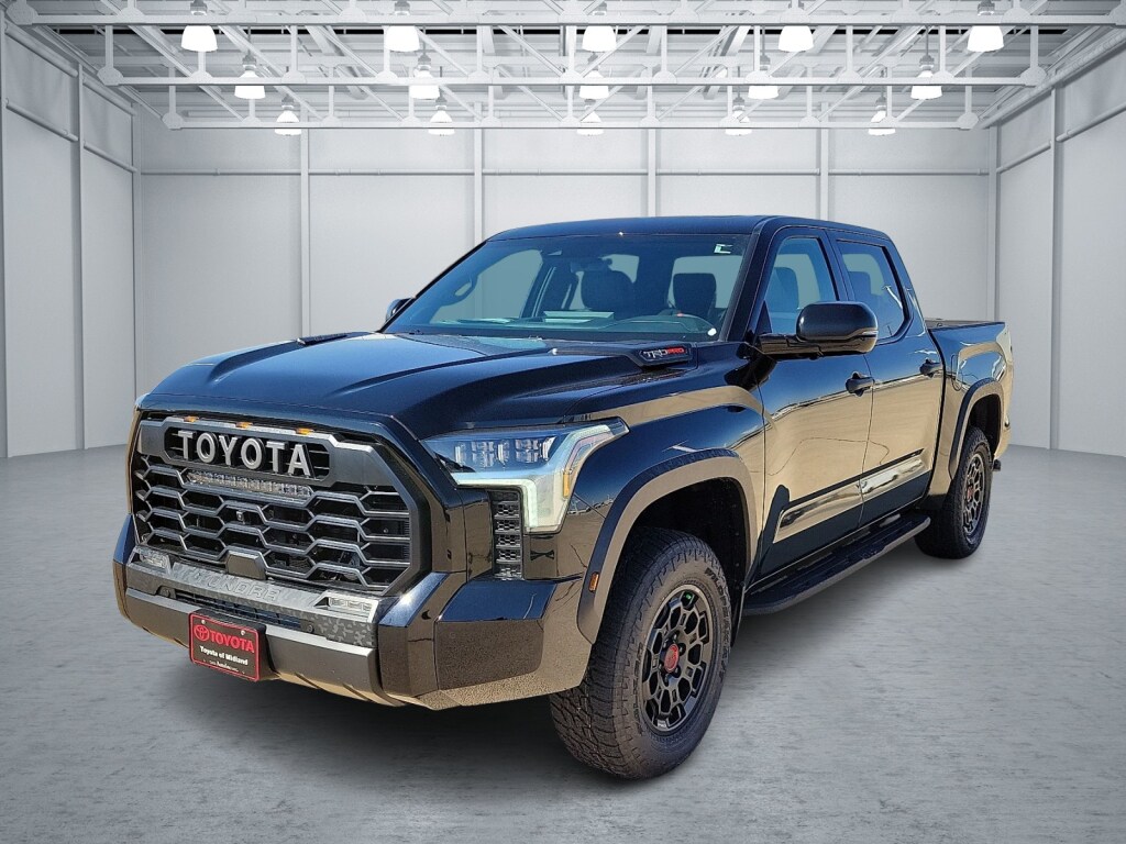 - TRD PRO hood badge; black door handles; black window molding and mirror caps; black technical-camo-grained tailgate spoiler and overfenders with marker lights